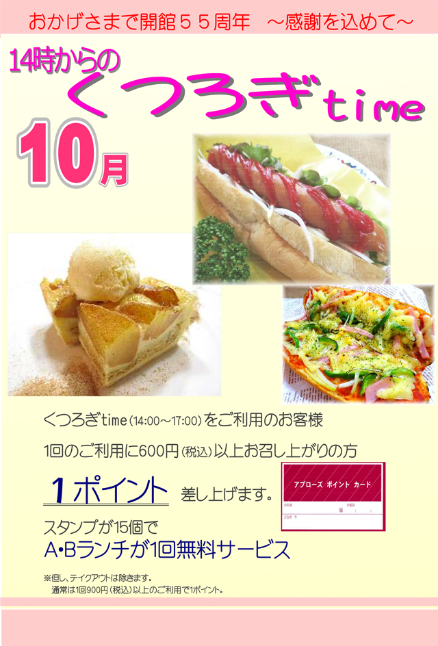 くつろぎtimeの14時~のご利用で600円(税込)以上ご利用で1ポイントサービス致します。