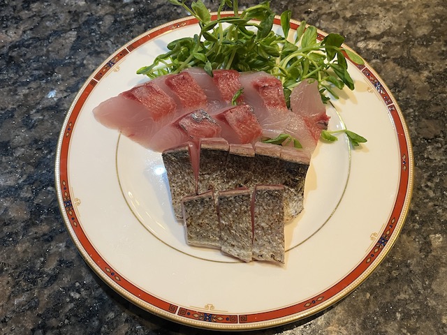 朝網での漁れたてで鮮度抜群の魚であった為、まず皮を引いて普通に刺身をつくりました。加えて、厚い皮目が美味しいとのことで、炙って焼き霜造りの刺身も作りました。次に皮をしっかりと焼いたムニエルを作ってみました。