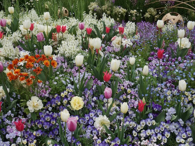パンジー、ビオラ、ネモフィラ、ルピナス、ネメシア、チューリップなど