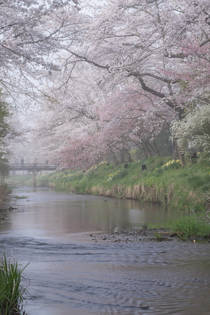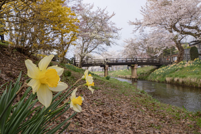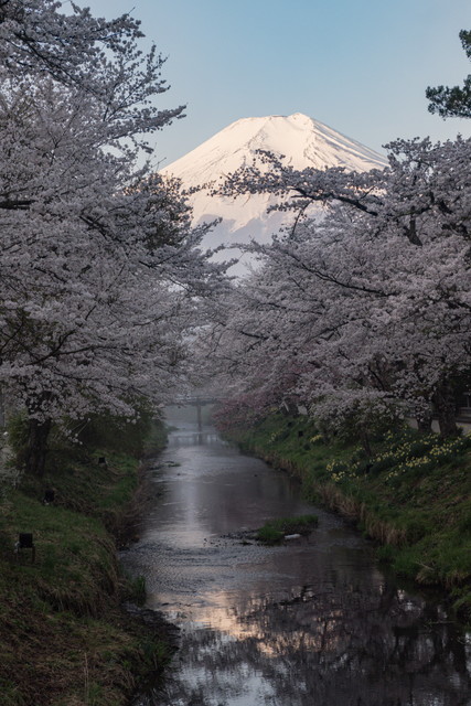 忍野八海の近く、新名庄川沿いの600本近くのソメイヨシノが満開になったと聞き、4月21日の早朝訪れました。朝から晴れて富士山も良く見えました。外国人観光客も大勢訪れていました。桜並木のライトアップが4月26日まで実施されます。