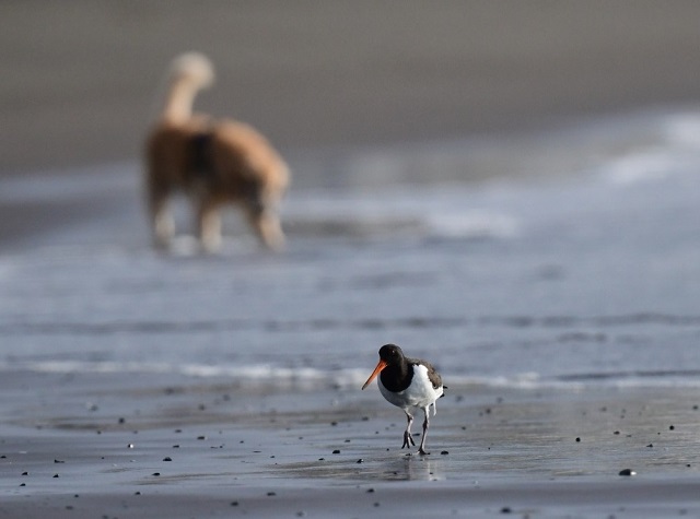 一方、実際の「都鳥」(写真右2枚)は、ユリカモメとは別、チドリ科の冬鳥です。どちらも、足とくちばしが赤色で似ています(体長45㎝、背羽は黒い)。都鳥は、渡来が局所的であまり見かけないことと、「都鳥」の雅名(詩歌で使われる名)が印象的であるため、よく見かけるユリカモメを都鳥と呼ぶことが文学の世界では行われてきたようです。