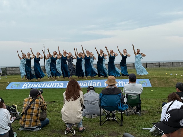 江の島の海を背にした芝の公園のステージでは20を超えるフラダンスサークル、教室メンバーが ゆったりと優雅な踊り、華麗な踊りを披露していた。観客も近くの芝に座りながら ご家族でしょうか友人でしょうかビデオカメラ、スマホでその踊りを撮影する姿が多く見られた。