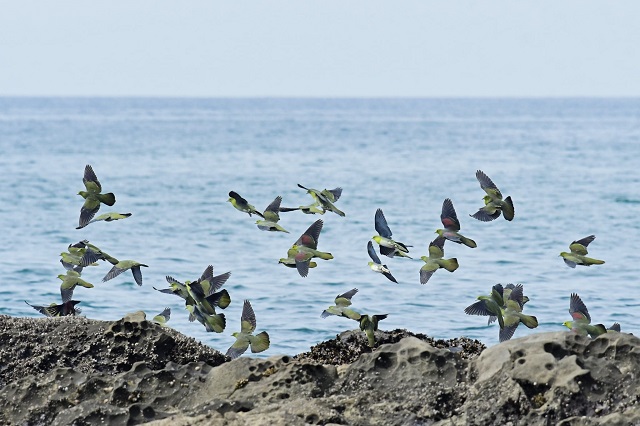 主食は果実や種子ですがカルシュウムが不足するため海水吸飲で補います。体長は33センチほど全体はオリーブ色。オスは肩から羽にかけてブドウ色です。メスはオリーブ色ですので見分けられます。嘴はきれいなライトブルーです。