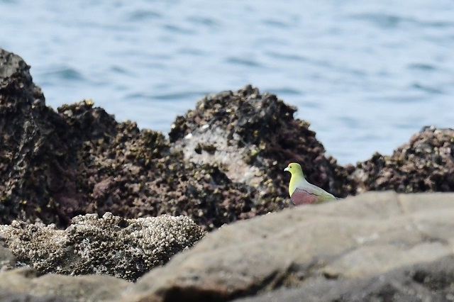神奈川県の天然記念物に指定されている緑色の美しい鳥。毎年4月から11月頃まで大磯の照ヶ崎海岸に海水を飲みに飛来します。
