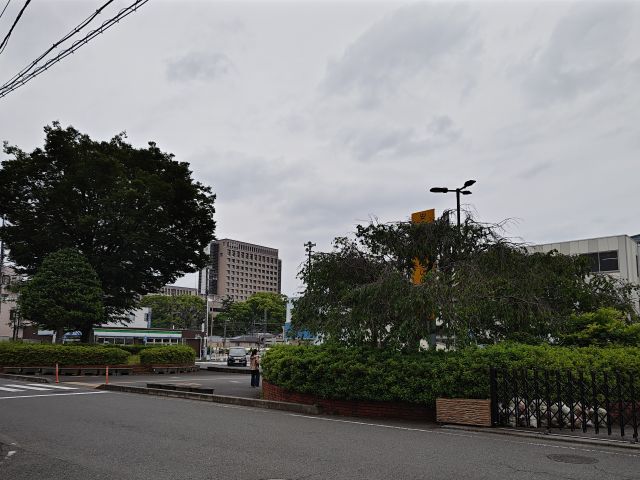 駅東口の大樹の下には、亀井野一丁目から六丁目までの区画整理完成の記念碑があります。