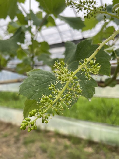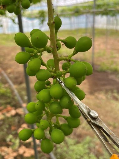 ブドウは房の形をしたつぼみに花が咲くと、めしべの一つ一つが実になります。粒を大きく育てるために、一房あたりの粒をバランスよく減らして形を整えていきます。