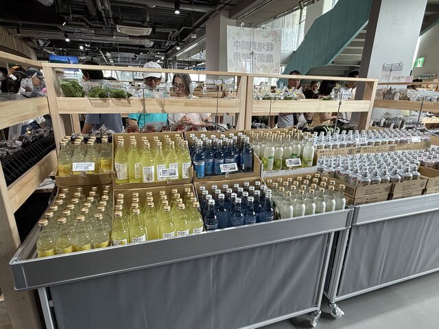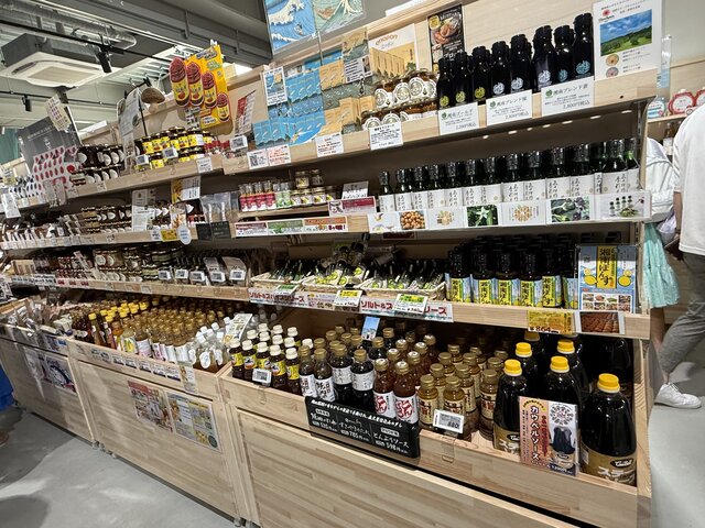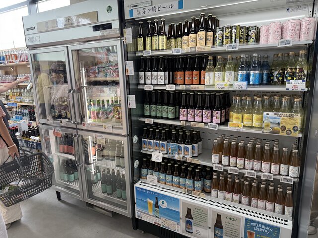 湘南ゴールドやレモンなど、地元果実を使ったジュースやサイダーが棚いっぱいに。ラベルデザインもおしゃれで、お土産にもぴったりです。