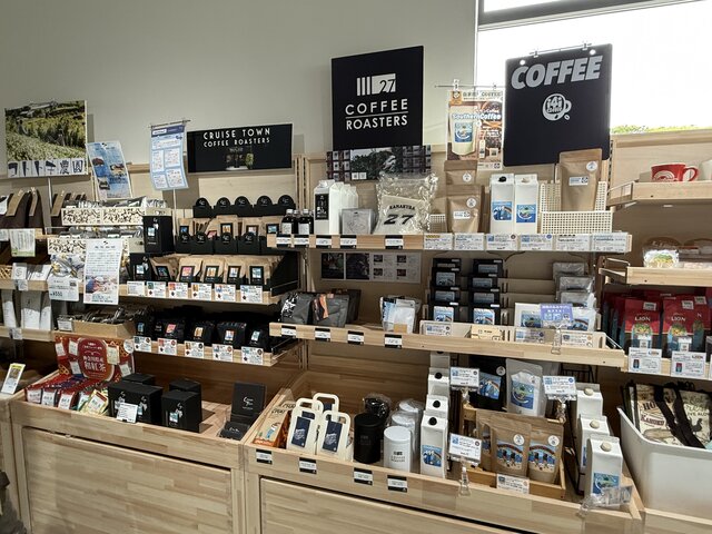 地元焙煎所の本格的なコーヒー豆や、各種調味料、小物グッズも揃っています。自宅用にもギフトにも最適なパッケージデザイン。