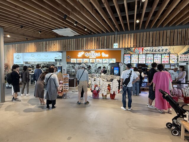 建物2階は、フードコートエリア。家族連れや友人同士で広いガラス窓から外を眺めながらの食事が楽しめます。地元の有名店のしらす丼やラーメン、ソフトクリームまで、湘南の名物がずらりと並んでいます。一階には人気のアイスクリームやテイクアウトがあります。