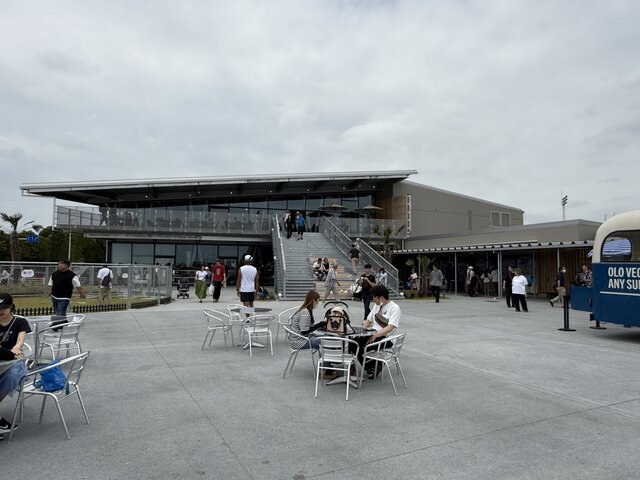芝生に沿った入口には、白いロゴが印象的な「SHONAN CHIGASAKI」の文字。周りも広々としており開放感のある建物。正面にはゆったりとした交流広場があり休憩したり歓談が出来る。