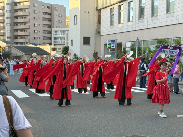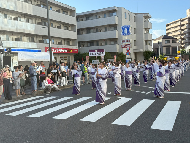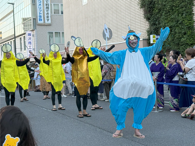 ミナパーク前の道路では、「流しおどり遊行ばやし」が繰り広げられ、遊行おどり、西馬音内盆踊り、郡上おどり、阿波おどり(高円寺朱雀連)や、市内外から集まった20の踊り団体が、それぞれの個性を生かした衣装と踊りで観客を沸かせました。飛び入り参加連では、ユニークな仮装で参加の藤沢市長を始め市の主だった方々が踊りを披露し観衆の拍手喝采を浴びていた。