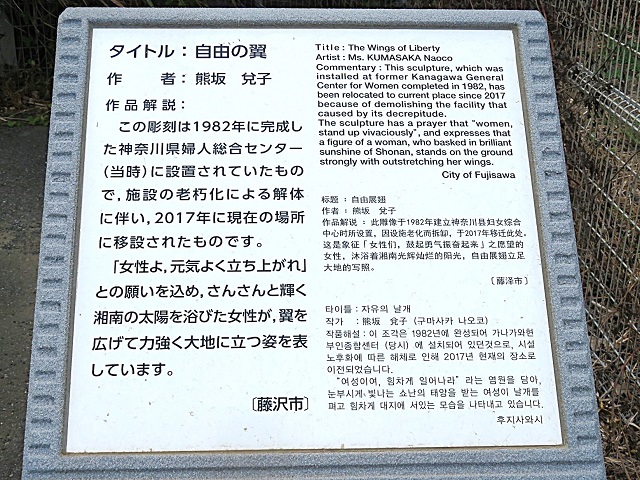 像の脇にある市の作品解説には『「女性よ、元気よく立ち上がれ」の願いを込め、さんさんと輝く湘南尾太陽を浴びた女性が、翼を広げて力強く大地に立つ姿を表している。』とあります。2015年、女性センタは移転し、現在は藤沢合同庁舎に移転し「県立かながわ男女共同参画センタ」となっています。「自由の像」は跡地から隣接の現在地に残されています。