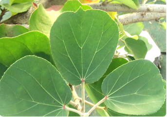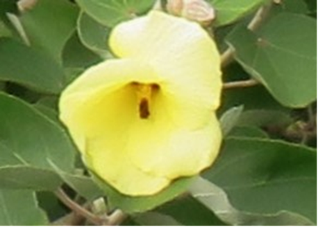 ハマボウ(浜朴)Hibiscus hamaboはアオイ科フヨウ属の落葉低木で、関東地方南東部以西から四国・九州の暖地の海岸などに自生する塩生植物です。江の島では北緑地・駐車場前の広場などに植栽されています。幹からよく枝分かれして樹高は1~3㍍になります。樹皮は帯緑灰色で、若い枝には灰色の星状毛が密生して白っぽく見えます。葉は互生し、葉柄の長さは1~3㌢、葉身は長さ3~7㌢の倒卵状円形、葉質はやや厚く先端 は短く尖り、葉縁には細かい鋸歯があります。基部は浅い心形で、起点から掌状脈が伸びます。葉の表面には灰白色のかたい毛が散生し、裏面には密生して白っぽく見えます。花期は7~8月、枝先の葉腋に直径5~7㌢の淡黄色の花を1~2個開きます。