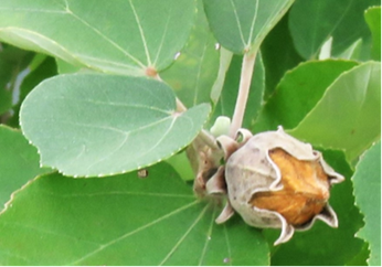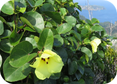 小笠原諸島の山地には、小笠原群島の固有種であるフヨウ属のテリハハマボウが自生し、三日月山や森林生態保護地域、歩道わきなどでも見ることができました。樹高は3~10㍍以上になり、葉は緑色で厚く艶があり、ふちは全縁で葉の先端は尖ります。花は一日花で黄色から赤色に変化します(写真は11月下旬に撮影)。また海岸付近などに自生する、オオハマボウ(カイガンイチビ)の開花は6~7月、今回の旅で花を見ることはできませんでした。