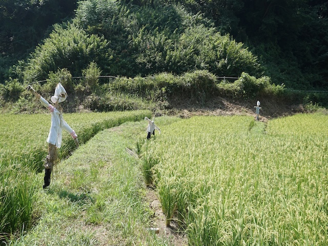 谷戸の稲穂「谷戸米」の田んぼと案山子「カカシ」