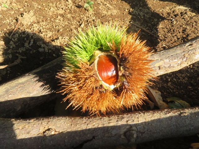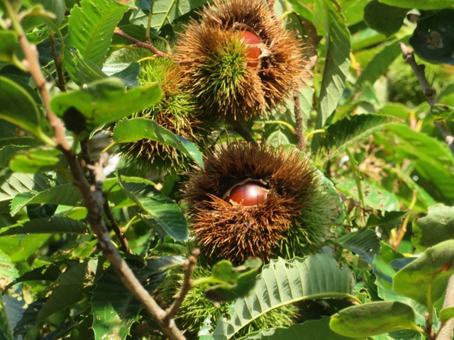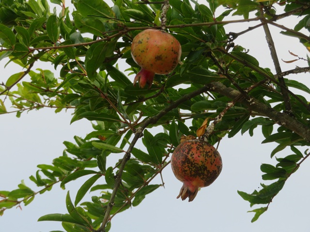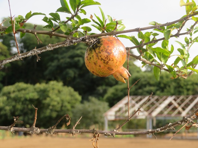落ちたばかりで見上げると枝の栗も毬が割れて顔を出していました。目を転じるとザクロの実も大きくなってきました。ようやく秋の気配を感じられるようになってきました。