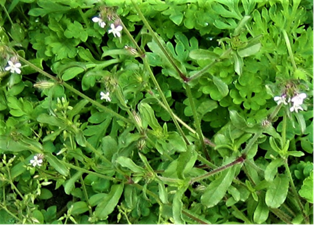 シロバナマンテマ(白花マンテマ)Silene gallica var gallicaはナデシコ科マンテマ属の1年草、ヨーロッパ原産の帰化植物で江戸時代に栽培目的で移入されたものが野生化し、日本各地の海岸の砂地や市街地などに見られるようになりました。江の島では海辺や広場の片隅の草むらなどに生育しています。茎は横にはい、そして立ち上がって高さは20~40㌢になり、長短の腺毛や開出毛が見られます。葉は対生につき葉柄はありません。葉は全縁で長さは2~5㌢、下部につく葉は大きく、上部につく葉は小さくなります。下部につく葉の先は円頭、上部の葉は倒披針形で先端は尖ります。花期は5~6月、茎の上部に総状花序をだして白色~淡紅色の合弁花をつけます。花冠の直径は約7㍉で、裂片は倒卵形、雌しべは1個で雄しべは10個、花柱は3個あります。
