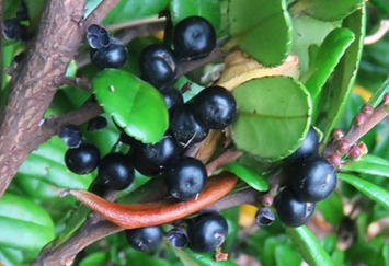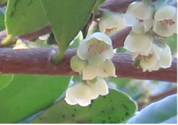 萼片は5個で花柄の長さは2~3㍉。花は鐘形で花弁は5個あり、下向きに開いて直径2~6ミリ、雄花は雌花よりやや大きく、雄しべが10~15個あります。雌花では雄しべは退化して、雌しべが1個、花柱は3裂します。花には独特の臭気があります。果実は液果で、直径約5㍉の球形、11~12月に黒く熟して、中に10~20個の種子が入ります。名前の由来は、浜に生えるヒサカキ(姫榊)で、神事に用いるモッコク科のサカキ(榊)より小型であることから、とされています。ハマヒサカキは神事には用いられていませんが、潮風や害虫などに強く、生垣や道路の分離植栽、防潮などにも利用されています。