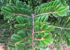 ハマヒサカキ(浜姫榊)Eurya emarginataはサカキ科サカキ属の常緑低木で、雌雄別株。千葉県以西、四国、九州、沖縄に分布し、暖地の海岸に生えます。江の島では広場、歩道、車道などの生垣にもよく用いられており、島内のいたるところで見ることができます。樹皮は暗褐色でなめらか、浅く縦列して、高さは1.5~5㍍になり、若枝は淡褐色の短毛が密生します。葉柄は 0.1~0.2㍉と短く、葉は互生し、側枝は2列に並びます。葉身の長さは2~4㌢、幅1~1.7㌢の長倒卵形で、質は厚く革質で、光沢があり、縁には浅い鋸歯があります。葉先は丸形またはややへこみ、基部はくさび形で、葉縁はやや反ります。裏面は淡緑色で、主脈は裏面に隆起します。花期は 10~12月、雌雄異株で葉腋に緑白色の小さな花を1~4個束生します。