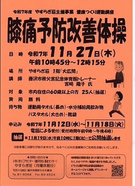 令和7年度 やすらぎ荘主催事業 健康つくり運動講座「膝痛予防改善体操」を開催します。
