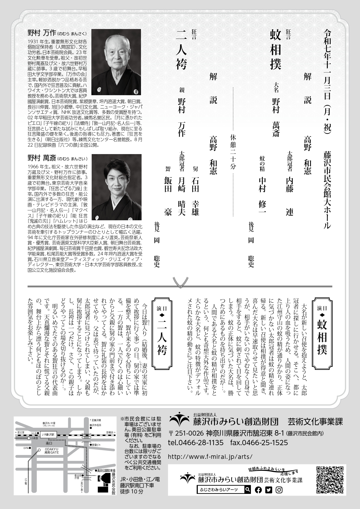 野村万作・野村萬斎 藤沢狂言会2025 「蚊相撲」「二人袴」 藤沢市民会館大ホール